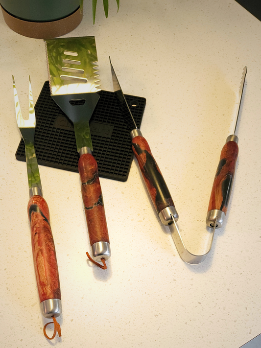 Kit de BBQ en stainless fait en loupe de bois et époxy noir